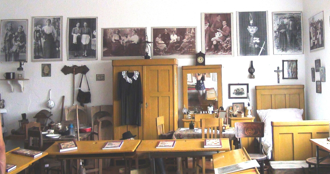 Néhány egyszerű bútor és a falon elhelyezett tablókról ránk csodálkozó régi bucsai lakosok
